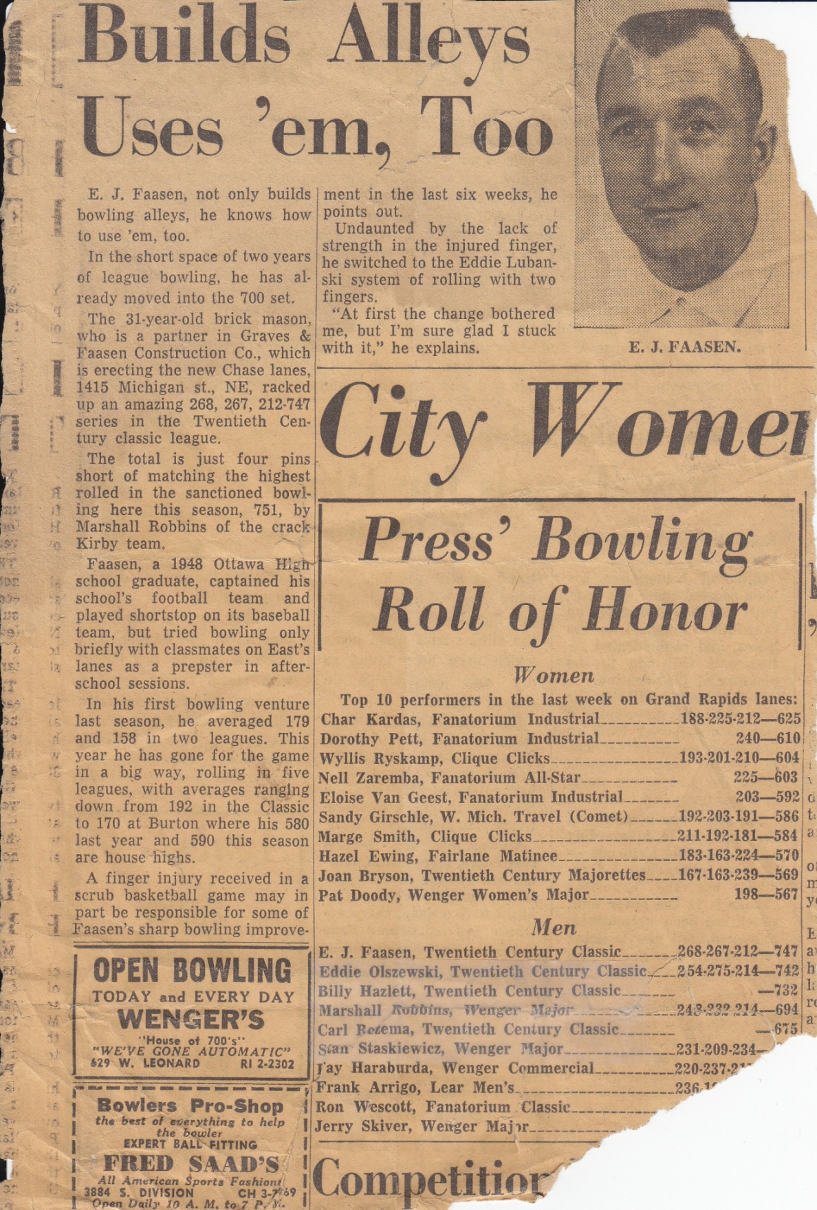 E.J. started as a masonry contractor. He did a lot of commercial work in Michigan and in Florida, where he built housing on Patrick Air Force Base near Cape Canaveral. He made many acquaintances in business and became something of a notable sportsman himself. He built several bowling alleys in the Grand Rapids area, got hooked by the sport and became Grand Rapids City champion. The first of several newspaper appearances records this early sporting career. (Illustration 3)