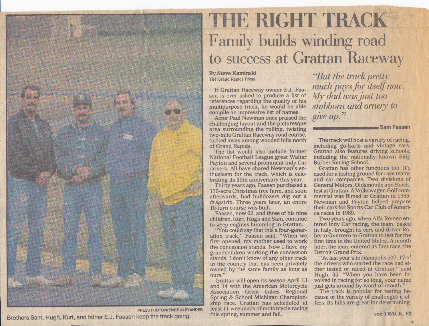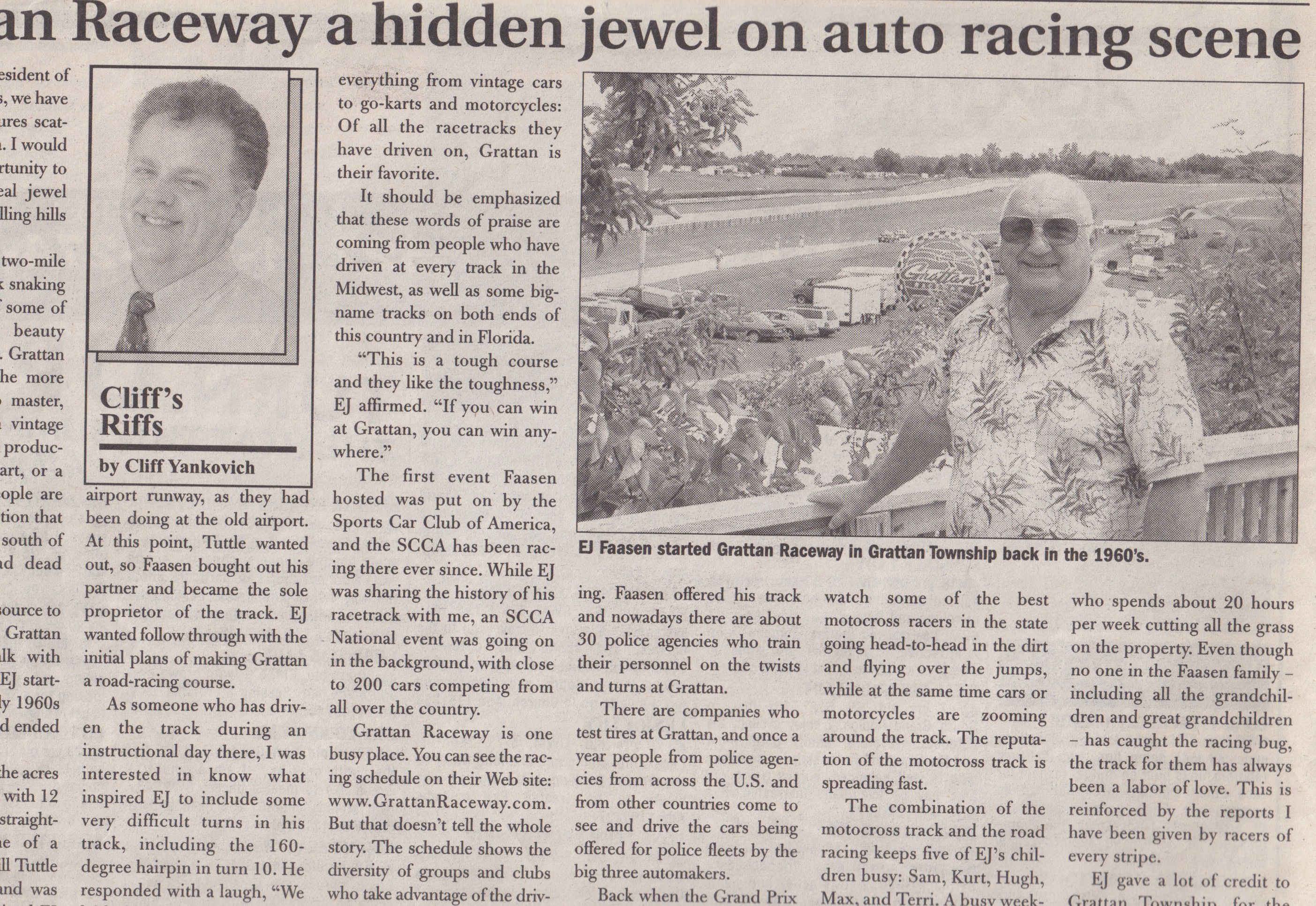 Edward Jack "E. J." Faasen is a businessman in the best sense and tradition of American small business and has been all of his life. At the center of the story of Grattan Raceway is the story of a small business coming out of the nineteen fifties and nineteen sixties in the United States, the story of a family business. E. J. and Mary Faasen's home, atop the main building at Grattan Raceway and his office are decorated with pictures of family, family outings and family events. Grattan Raceway is first and foremost a family business and E. J. Faasen is the patriarch.