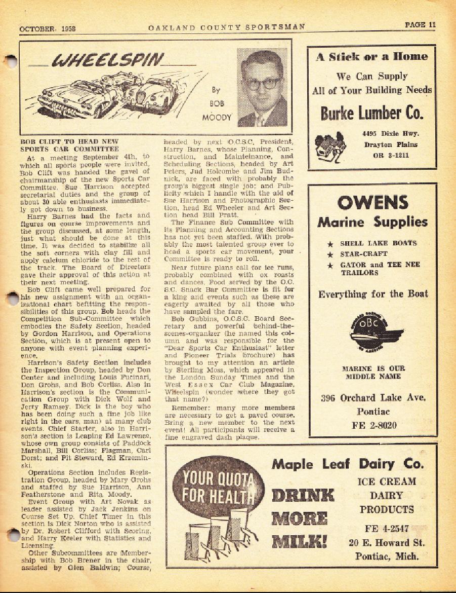 There is a great deal I would change in style, sentence and paragraph structure, but there are now better things to do; the facts and my sentiments are unchanged and are stronger today than ever. One of the hopes of the founders of the Oakland County Sportsman's Club was that it be an institution for conservation of dearly held American values and virtues. Road racing was pretty obviously not what they had in mind at first; but taking into account the changes in American society after the founding, through the Fifties and Sixties and then since, OCSC and WHRRI have succeeded in fulfilling that hope.